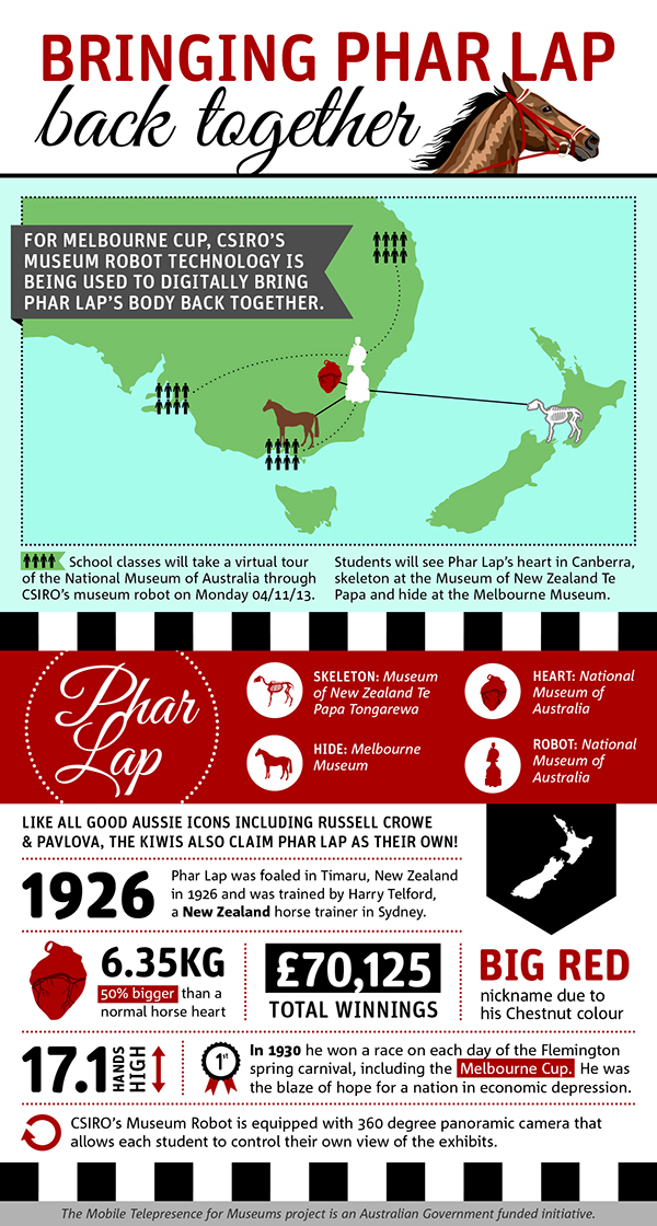 Today, students from three schools in Willunga, South Australia, Mornington Peninsula, Victoria and Townsville, Queensland will have the chance to see the legendary horse’s heart and hide and skeleton at the same time, while speaking to museum experts about the three exhibits. And they won’t even have to leave the classroom.
