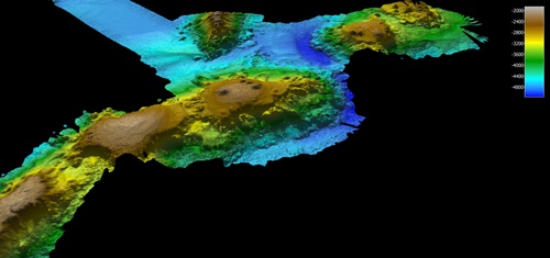 “Our multibeam mapping has revealed in vibrant detail, for the first time, a chain of volcanic seamounts rising up from an abyssal plain about 5000m deep, Dr Martin said.