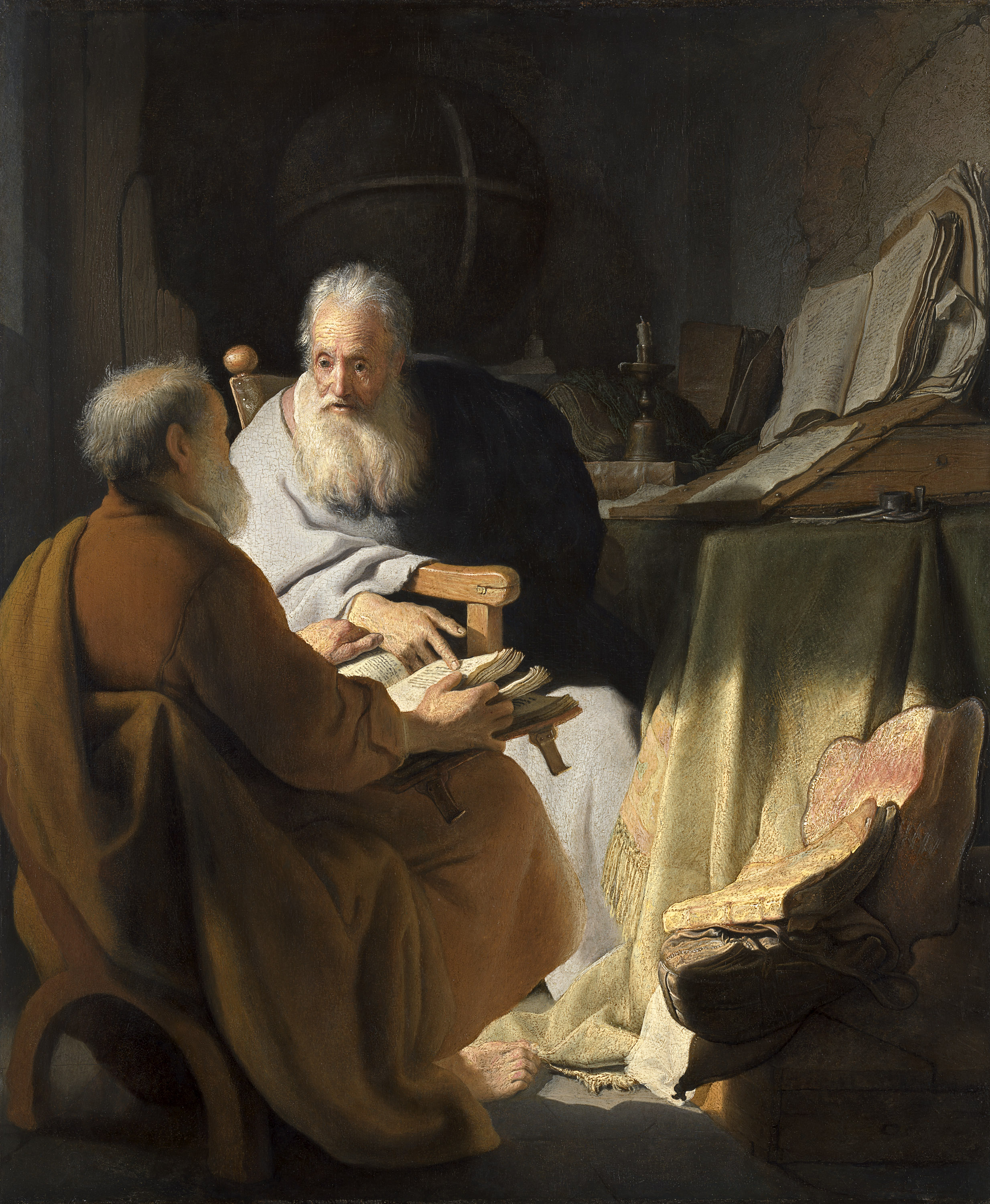 [Image changes back to show the painting of the two men in conversation again]