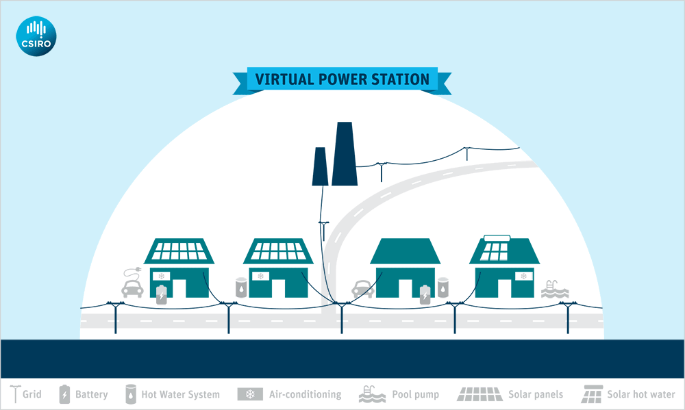 A virtual power station (VPS) links DERs – like rooftop solar PV panels – with energy storage and load control systems in a web-based network, to create a single reliable energy supply, much like a power station.